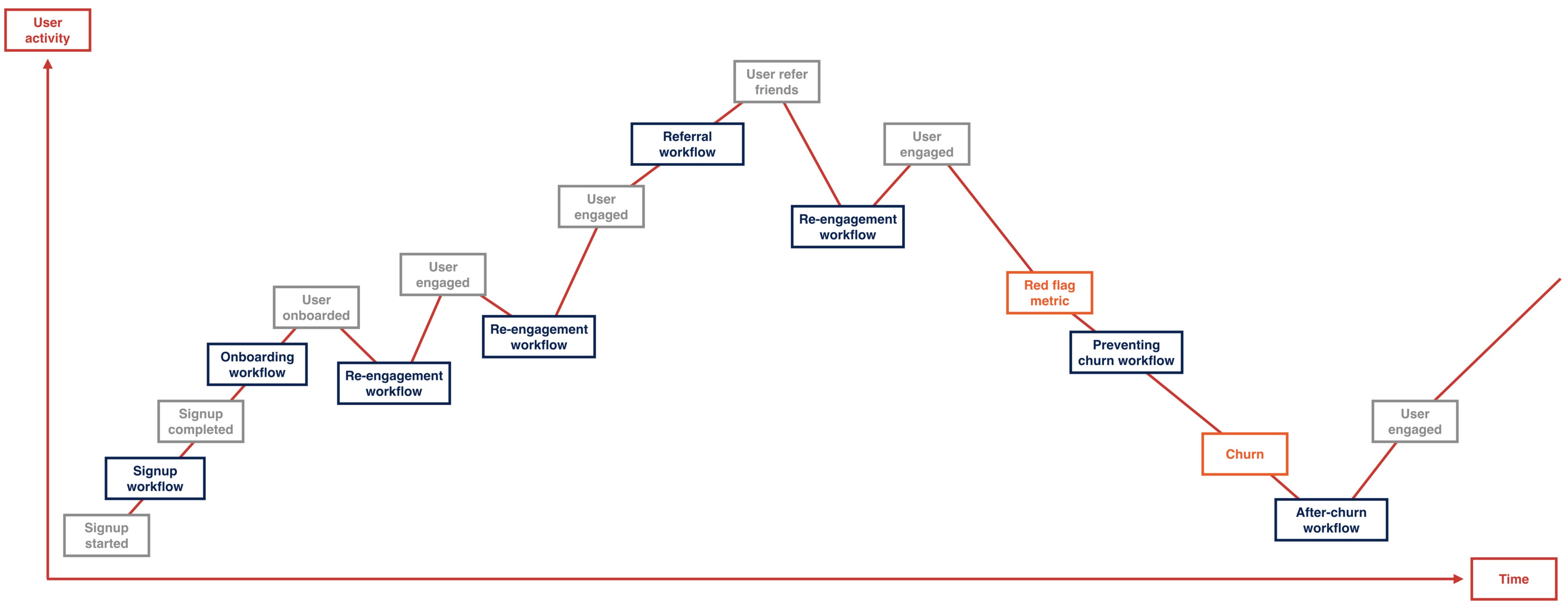 Obviously, the important part here is the trigger. It can originate from the user’s mind but more often than not it comes from you. Hence, you will need a workflow to trigger the user action, usually through a notification (email, text message, Facebook retargeting ad, etc.).